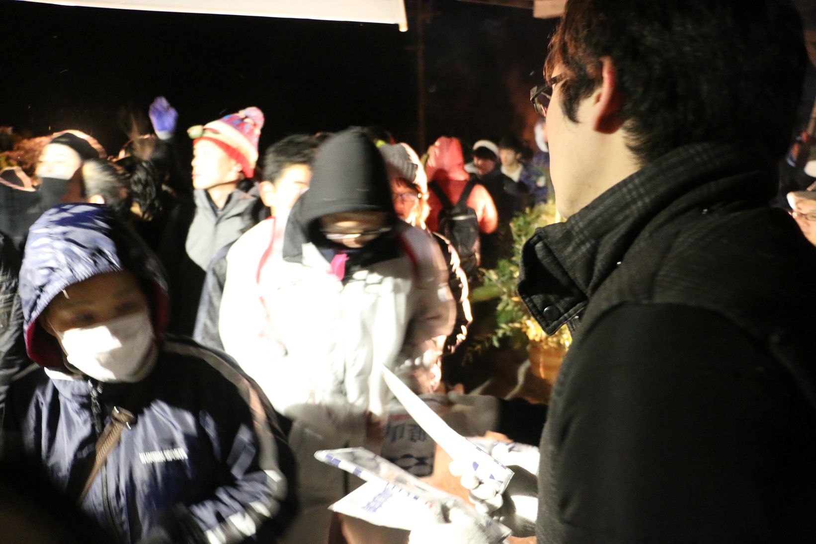 また、町観光協会では山開き記念の手ぬぐいを、元旦登山実行委員会ではティッシュや軍手などの記念品を配布し、たくさんの笑顔をいただきました(*^_^*)