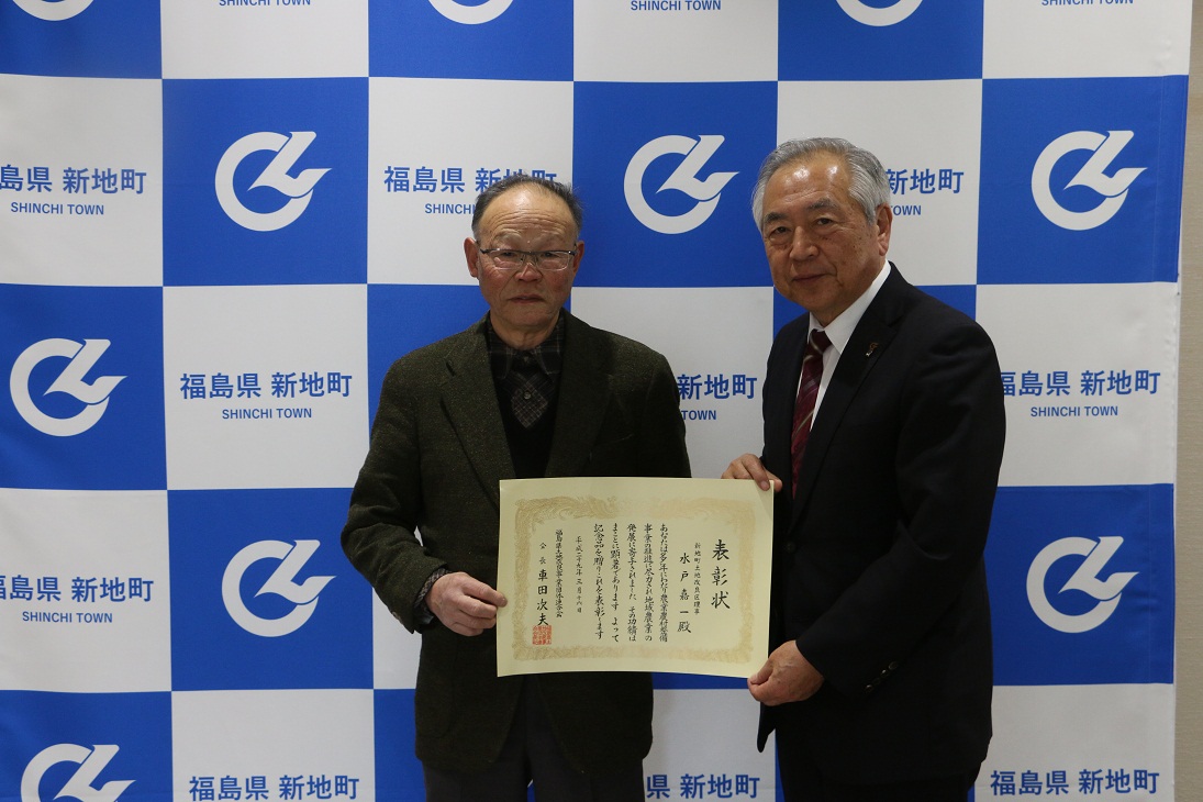 新地町土地改良区の水戸嘉一さんが福島県土地改良事業団体連合会から表彰を受け、受賞報告に町役場を訪れました。 水戸さんは、多年にわたり農業農村整備事業の推進に尽力され、地域農業の発展に貢献されまさした。