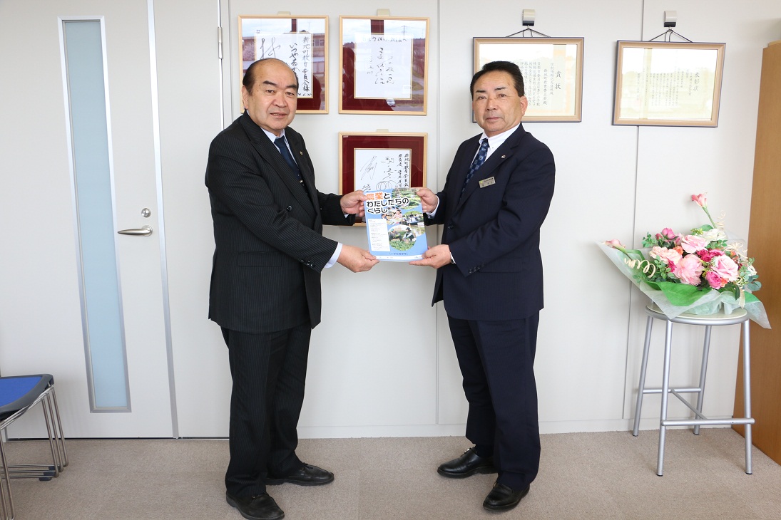 JA バンクから町教育委員会へ4月12 日、小学生向けの補助教材「農業とわたしたちのくらし」を寄贈されました。 教材本は農家の一日の仕事や農産物ができるまでの季節ごとの流れなどを分かりやすく紹介されており、毎年小学生高学年を対象とした食農教育等で活用されています。