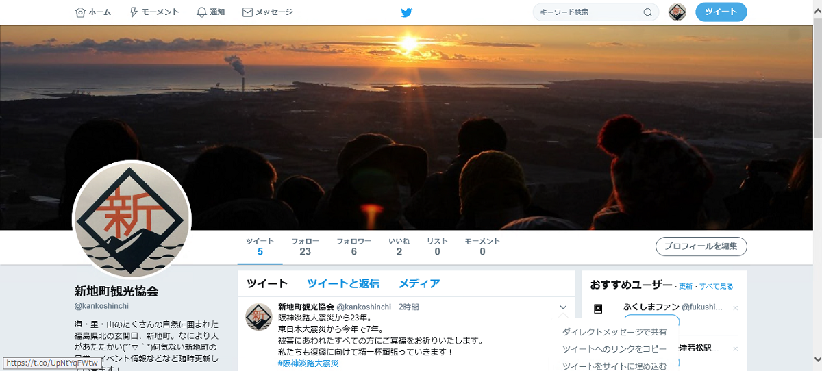 新地町観光協会では、このたびツイッターを始めました! 新地町の魅力、イベント情報、各種活動報告、新地町の何気ない日常風景、、、などなど、日々更新していきますのでチェックしてみてくださいね(*^-^*) 新地町を身近に感じていただけたら幸いです✨